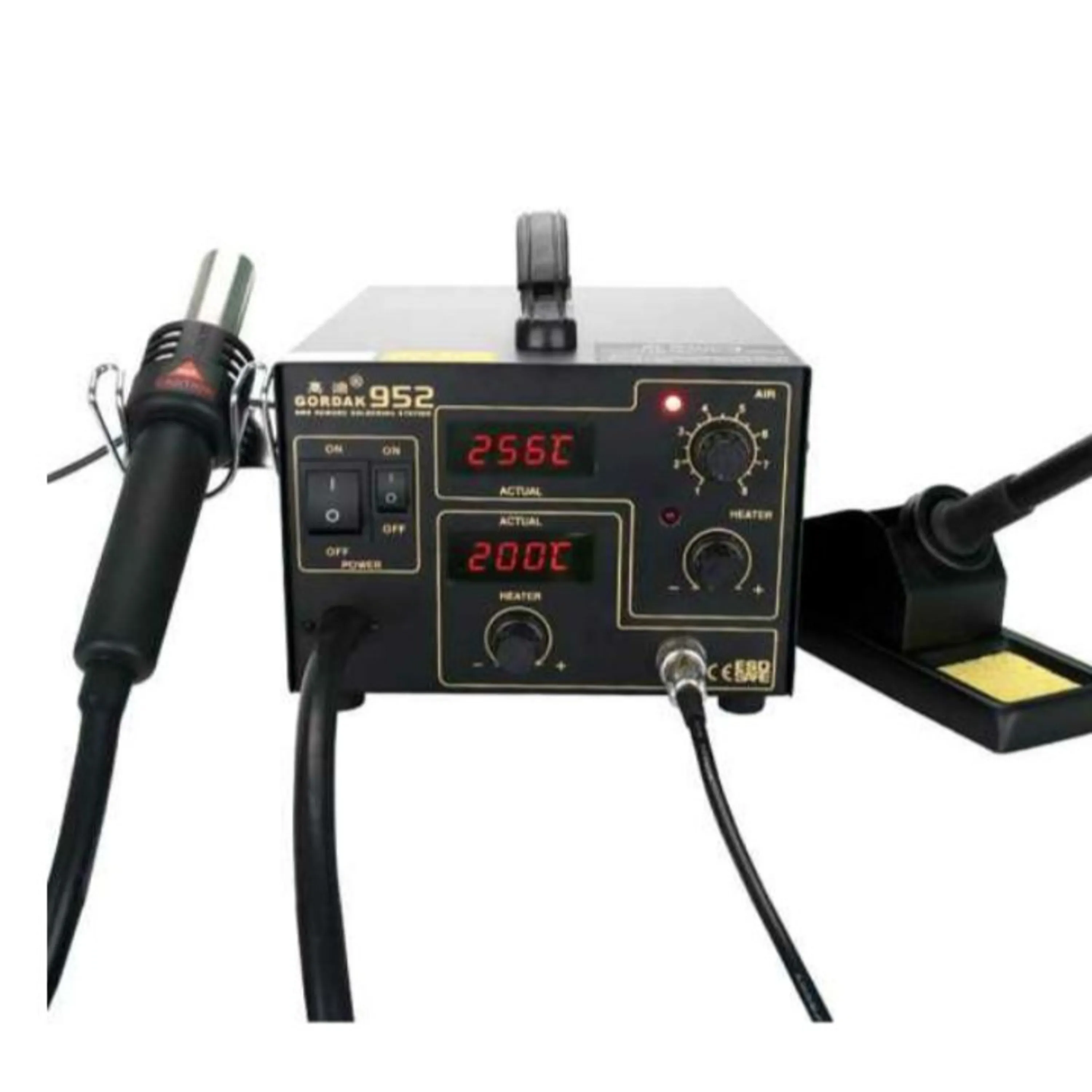دارای چهار سر نازل هوای گرم نوک هویه تیز صاف مخصوص SMD دارای دو صفحه نمایش دیجیتال تنظیم دما قابلیت تنظیم هوای خروجی دارای اسفنج نسوز پایه هویه فلزی توان هوای گرم 270 وات رنج دمایی 150 تا 500 درجه سلسیوس توان هویه 45 وات رنج دمایی 200 تا 480 درجه سلسیوس توان کمپرسور باد از 6 تا 23 وات هوادهی بیشینه 24 لیتر بر ساعت